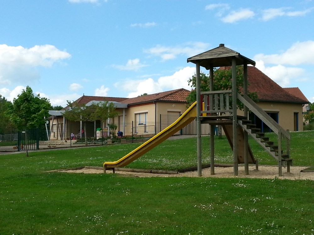 La grande cour avec marquage de terrain de jeux au sol et le préau permettent aux enfants de jouer en extérieur. Un espace vert sécurisé et aménagé en aire de jeu et d’activités sportives jouxte cet ensemble.